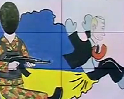 У Тернополі встановили стенд із зображенням солдата, який дає стусана президенту Росії Володимиру Путіну.