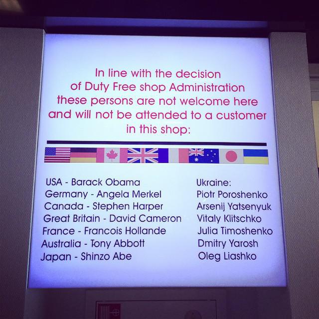 У міжнародному аеропорті Владивостока більше не будуть відпускати товари лідерам згаданих держав і спілок. Під жорсткі санкції потрапили глави держав: Барак Обама (США), Ангела Меркель (Німеччина), Стівен Харпер (Канада), Девід Кемерон (Великобританія), Франсуа Олланд (Франція), Тоні Ебботт (Австралія), Шінцо Абе (Японія).