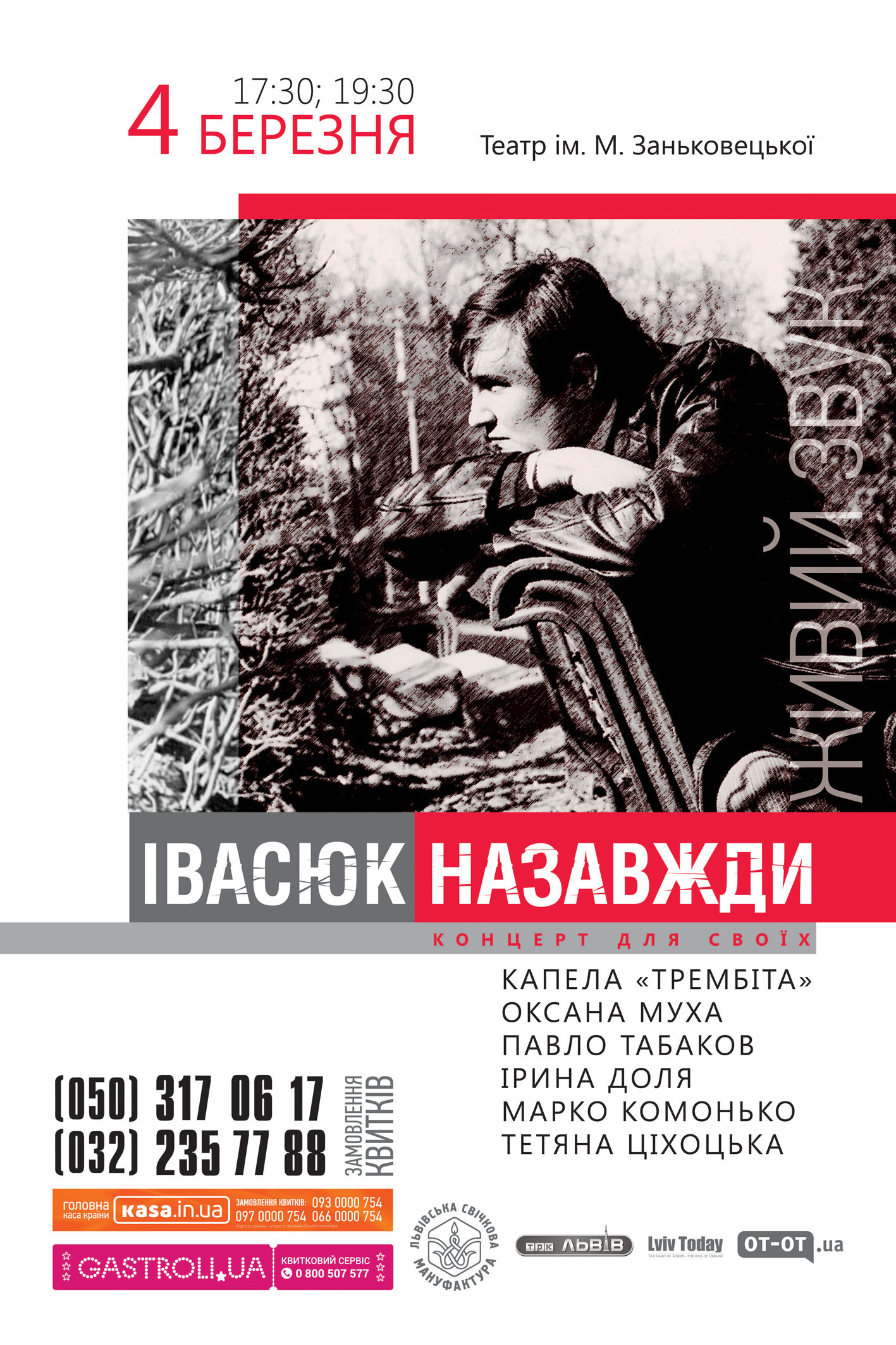 На початку весни, 4 березня, у львівському Театрі імені Марії Заньковецької (вул. Лесі Українки, 1) відбудеться концерт з нагоди 66-ої річниці від дня народження легендарного композитора Володимира Івасюка - «Івасюк назавжди. Концерт для своїх». Твори Івасюка прозвучать у виконанні Заслуженої академічної капели України «Трембіта», Павла Табакова, Оксани Мухи, Марка Комонька, Ірини Долі та Тетяни Ціхоцької.