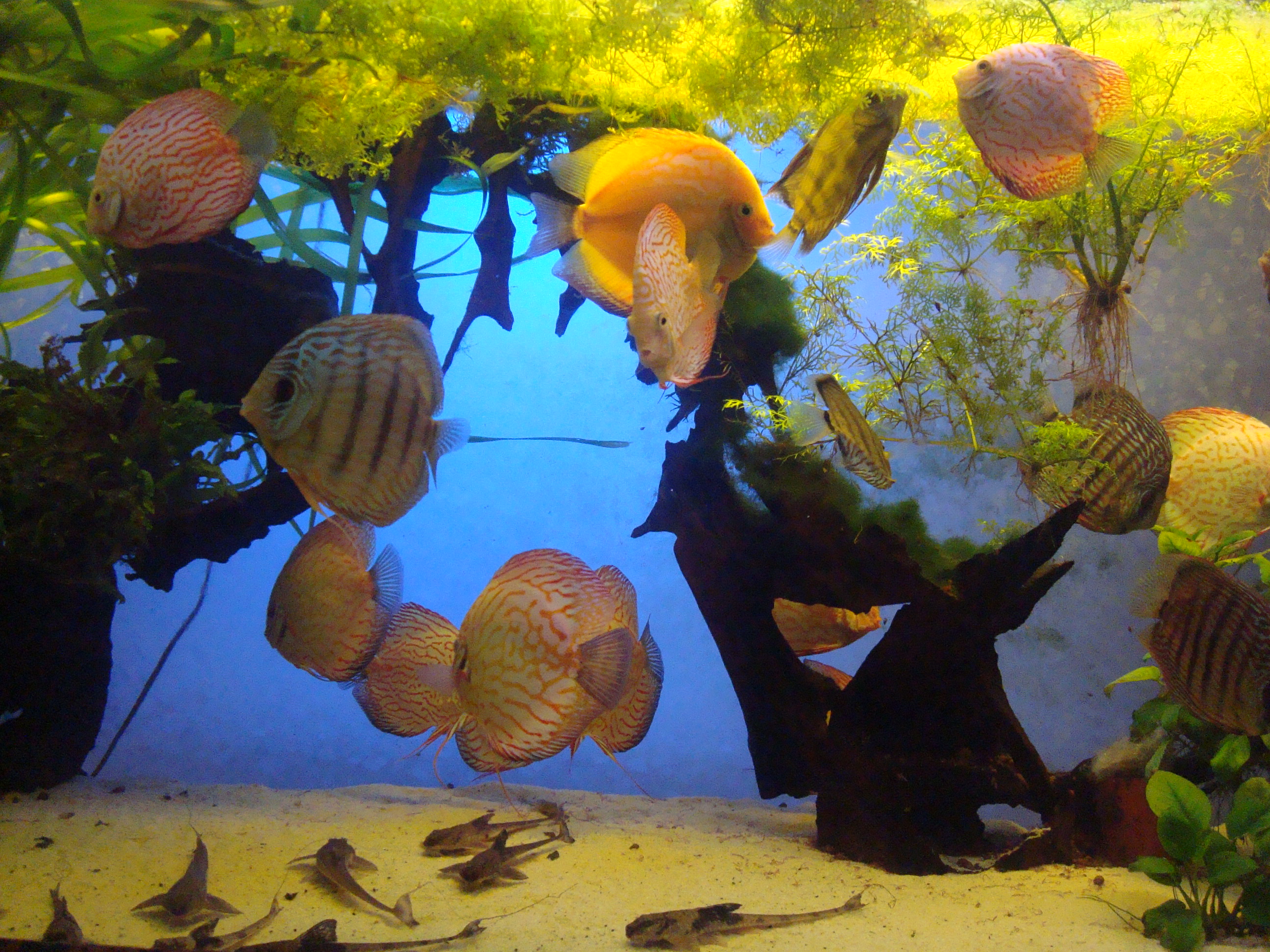 Мешканці акваріумів це дискуси, золоті рибки, поліптеруси, скляні соми, піранії, прісноводні скати та ін.
