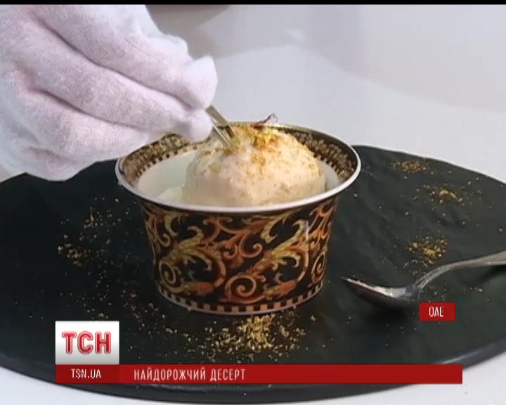 Одну кульку морозива, а саме стільки йде на порцію, прикрашають їстівним 23-каратним золотом і усе це подають у піалі та з ложечкою Versace - посуд клієнт може забрати з собою.