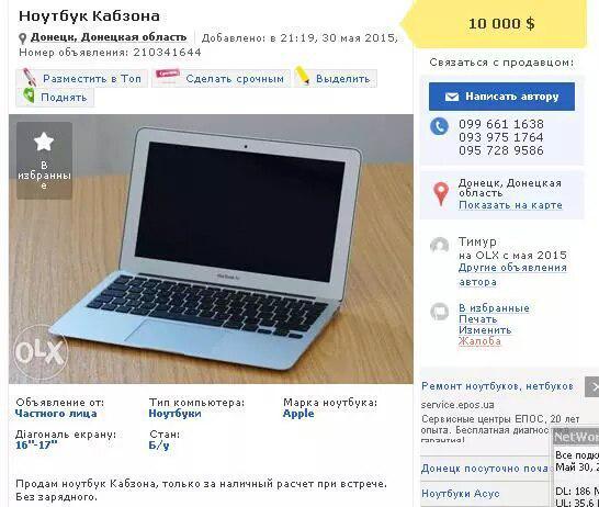 Автор оголошення вказав стан техніки – б/в - та зазначив, що до ноутбука немає зарядного пристрою. При цьому злодій навіть не приховує походження «трофея» і чітко вказує в назві товару: «Ноутбук КАбзона».