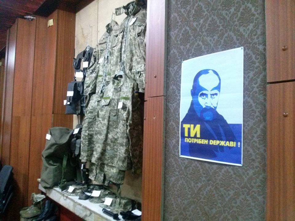 Тут стіни прикрашено українською символікою. На стелажах - обереги й вишиванки, військова амуніція, плакати на тему патріотизму, роботи художників-учасників АТО.