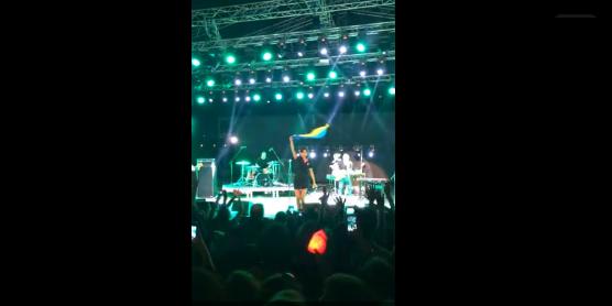 Далі синьо-жовтий стяг вона пов’язала на свій мікрофон, як це робить її друг, лідер Океану Ельзи Святослав Вакарчук.
