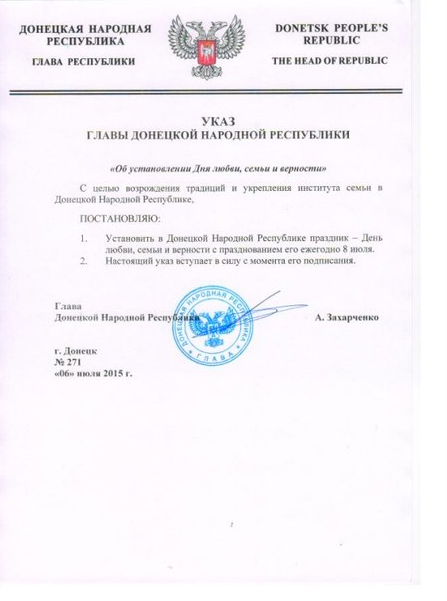 "З метою відродження традицій та зміцнення інституту сім'ї в Донецькій Народній Республіці постановляю установити свято - День любові, сім'ї та вірності зі святкуванням його щорічно 8 липня", - говорить так званий "указ".