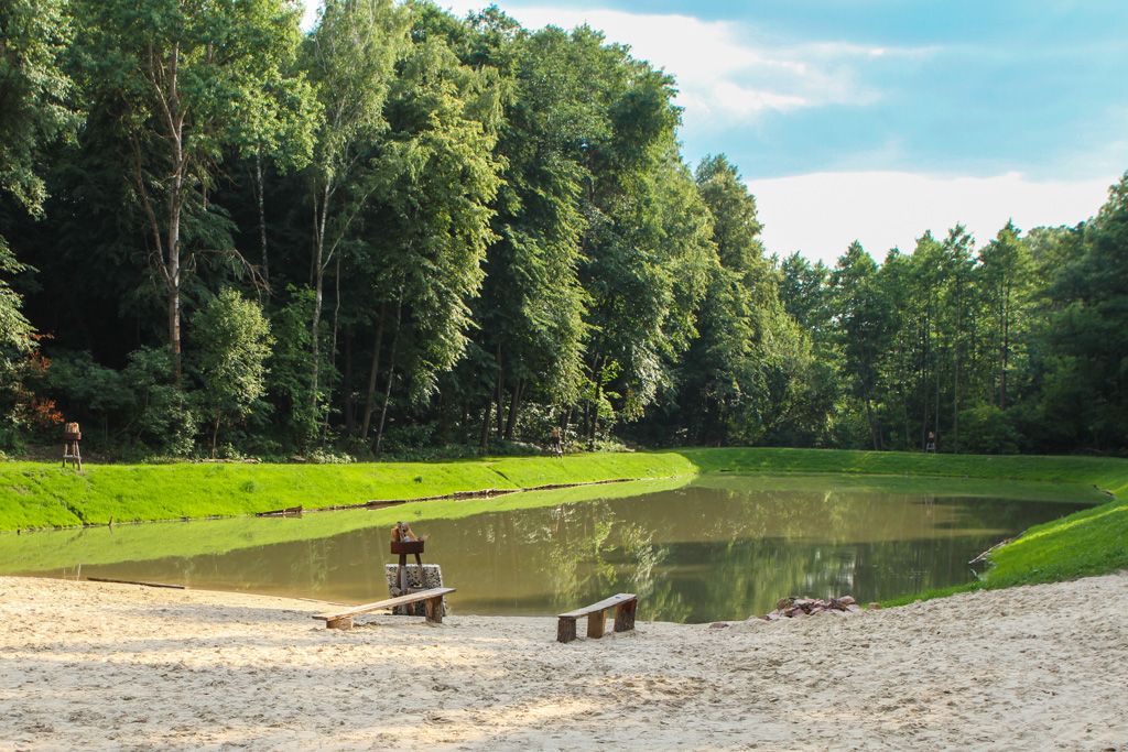 А далі за зеленою чашею газонів – стіною став правічний ліс. Вигляд озеро має просто казковий. Можна годинами милуватися водною гладдю , кронами дерев, що відображаються у ній, і слухати хор лісових птахів. А для тих, хто надає перевагу діям перед спогляданням, з одного боку озера обладнано піщаний пляж, з якого зручно заходити у воду, і де можна безпечно купатись навіть дітям.