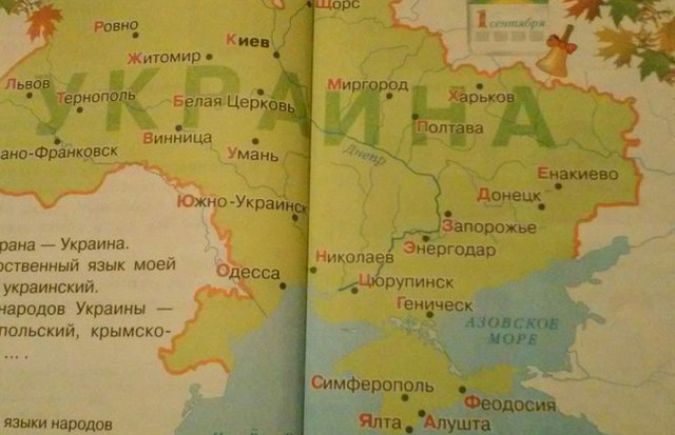Херсонським першокласникам роздали російськомовні букварі, на яких немає Херсона. Дніпропетровська, Черкас, Чернівців та Луганська. Зате на мапі помістилися Єнакієве, Генічеськ і Цюрупинськ.