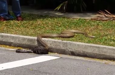 Сутичка двох змій - сітчастого пітона й королівської кобри - перетворилася на справжнє шоу з десятками уболівальників і роззяв, який зібралися навколо імпровізованого "рингу", яким стала територія поблизу однієї з будівель Наньянського технологічного університету в центрі Сінгапуру.