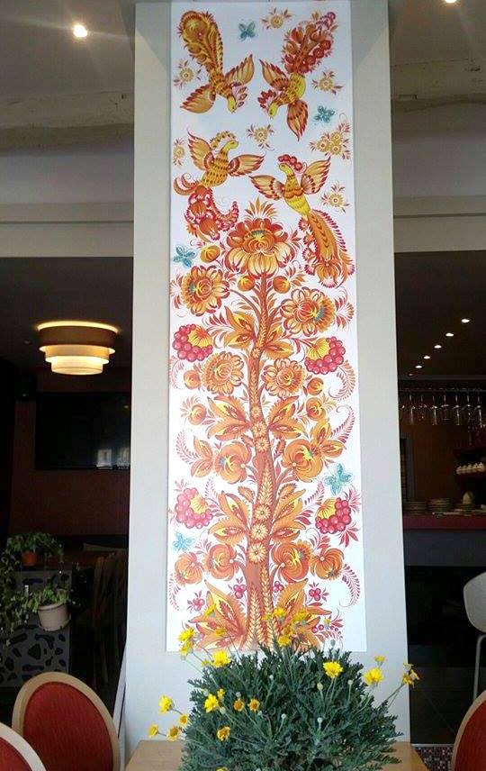 Декоративний розпис, у вигляді дерева життя, прикрашає одну зі стін приміщення. Також розпис використано в оформленні барної стійки-комина. Панелі з розписом вдало підсвічуються, та перетворюються на дуже гарні вітражі. Окрім цього в оформленні інтер'єру використані різноманітні розписані речі.