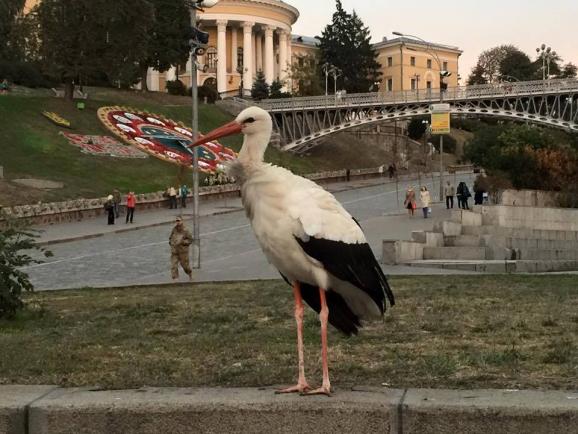 У Києві на Майдані Незалежності перехожі помітили блукаючого лелеку.