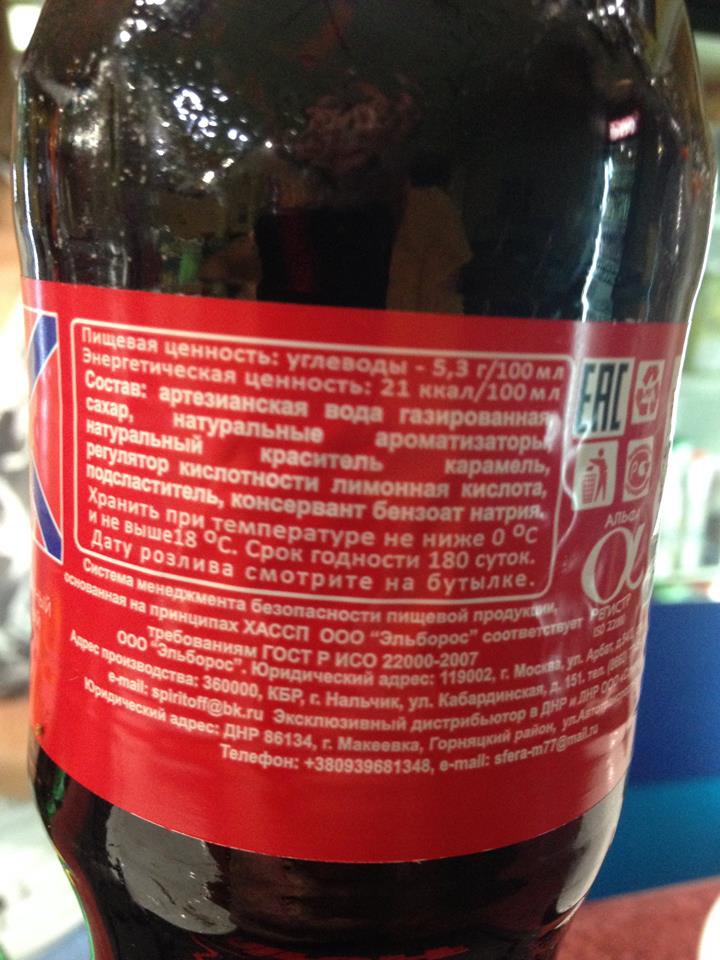 На території Донбасу, окупованій проросійськими бойовиками, продаються напої відомого бренду Cocа-Cola з юридичною адресою виробника в Макіївці.