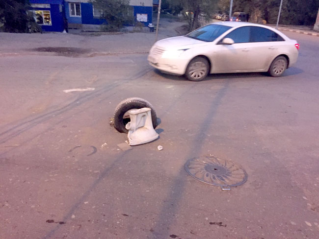 Поруч з дорожньою перешкодою посеред проїжджої частини саратовці встановили розбитий унітаз, а в сам колодязь встромили стару автомобільну покришку.