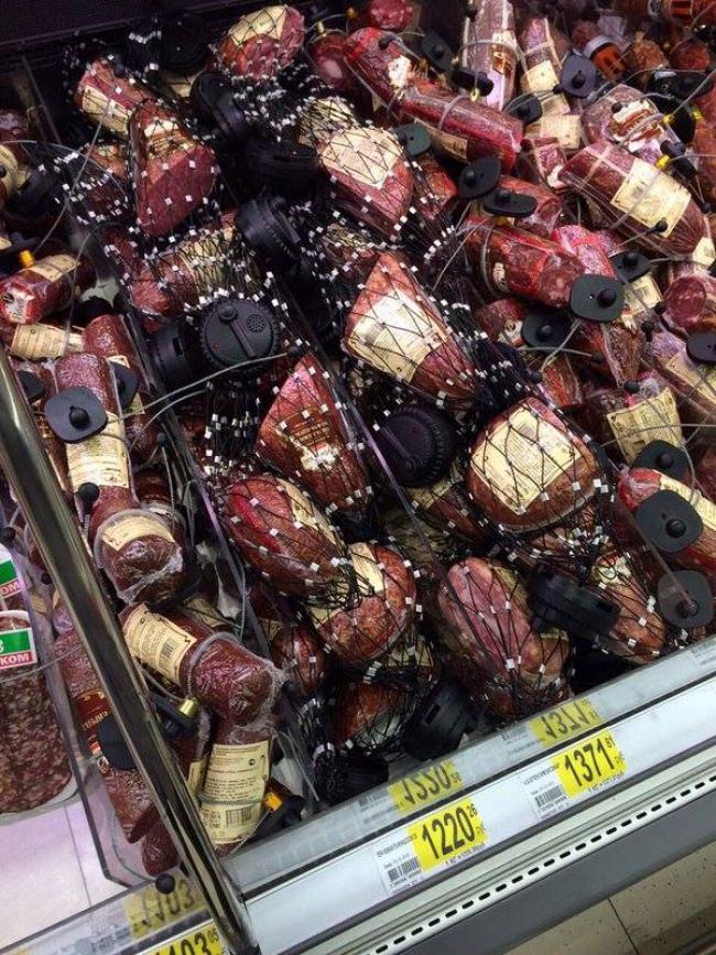 - Ковбаса, як і кордон - на замку; А в кредит її ще не продають ?; Мовою сухих економічних розрахунків це означає, що красти ковбаси стали на суму більшу, ніж вартість розміщення датчиків на ковбасі; Треба в закритих коробках, інакше відкусять; У 7 континенті, шоколад під замком в шафці скляній; З такими цінами, скоро всі продукти перейдуть у розряд шкідливих і небезпечних для здоров'я; Від погляду на ці ціни психіка відразу може похитнутися; Якраз та сама ковбаса, яка в Іспанії коштує 1.7 євро за довгу палицю; Цінники "радують": шинка в Польщі та Німеччині в районі 220 руб за кг починається. ковбаса дешевше. мабуть, через російські санкції страждають, бідолахи, - пишуть в коментарях.