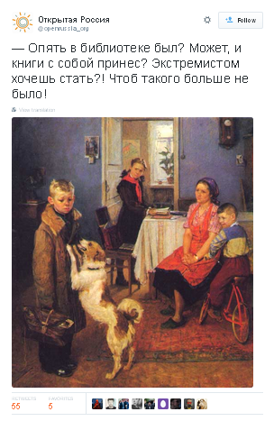 У Twitter фонду "Відкрита Росія", який заснований російським бізнесменом Михайлом Ходорковським, у зв'язку з інцидентом обіграли картину Федора Решетнікова "Знову двійка".