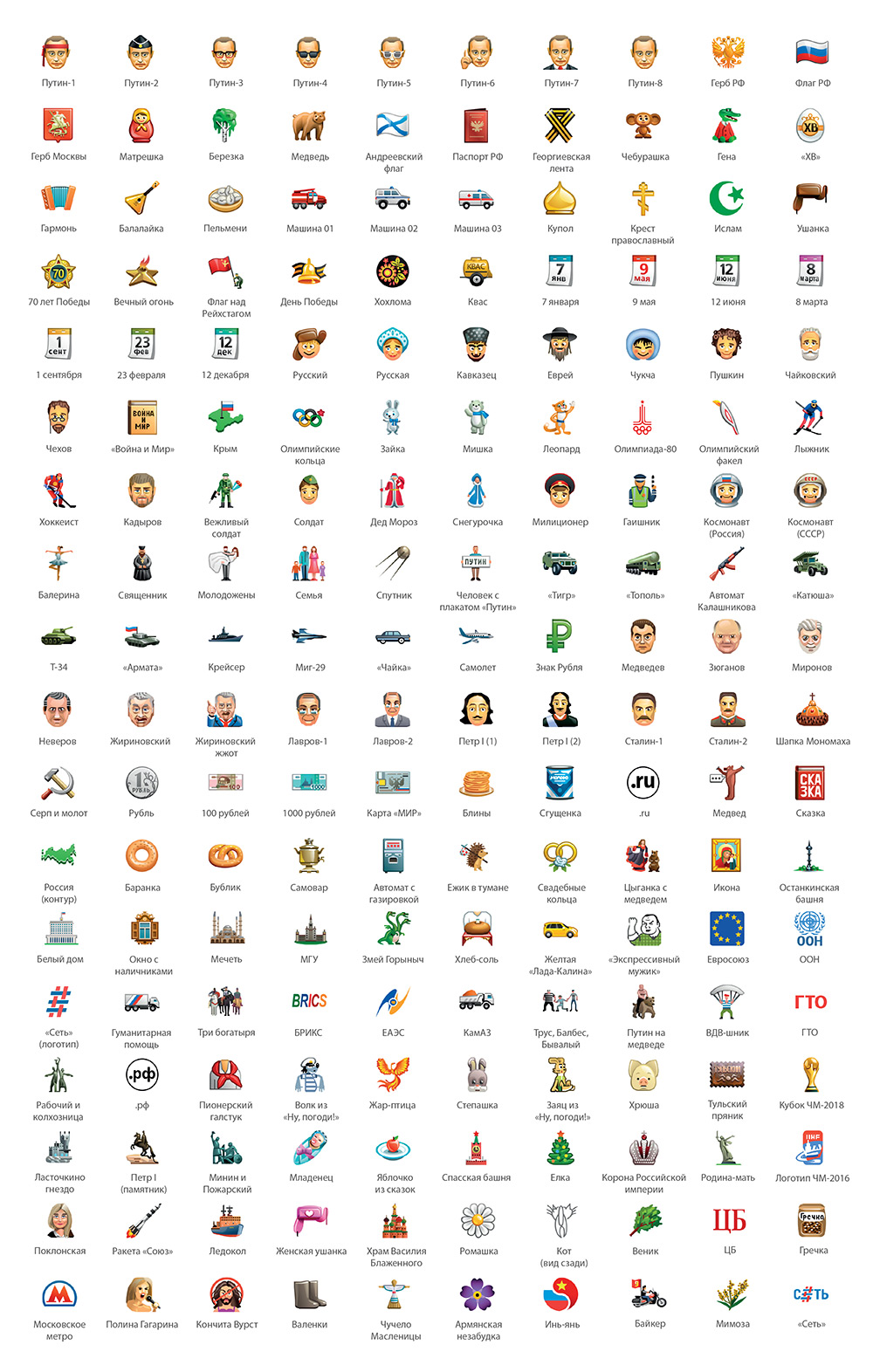 Йосипу Сталіну дісталося два. Є в наявності і смайлики з зображеннями лідерів парламентських партій: секретаря генради "Єдиної Росії" Сергія Невєрова, лідера "Справедливої Росії" Сергія Миронова, голови ЦК КПРФ Геннадія Зюганова. Керівнику ЛДПР Володимиру Жириновському до картинки дістався ще і підпис: "Жириновський жжот".