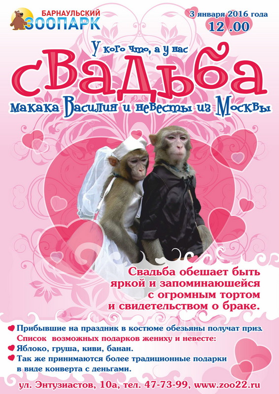 "Буде і весільний торт продаватися, і подарунки прийматися. В якості подарунків можна буде захопити з собою яблуко, грушу, банан або ківі. Ну а якщо Ви вже зовсім крутий гість, то і конверт з грошиками теж приймається", - розповів директор зоопарку Барнаула Сергій Писарєв.