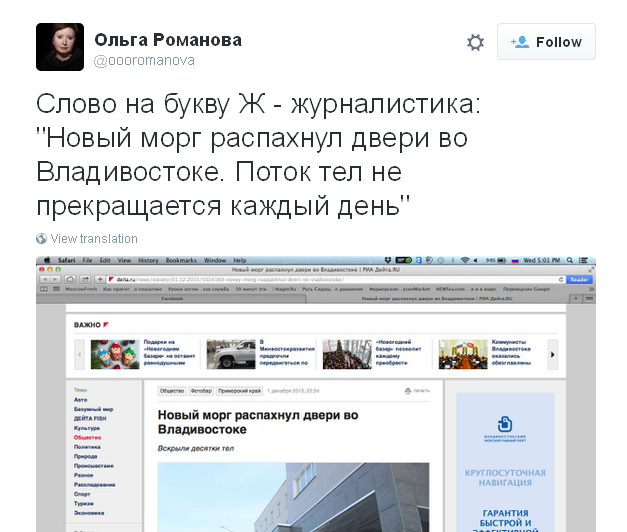"Слово на букву Ж - журналістика: "Новий морг відчинив двері у Владивостоці. Потік тіл не припиняється кожен день", - прокоментувала новину далекосхідного інформагентства журналіст Ольга Романова на своїй сторінці в Twitter.