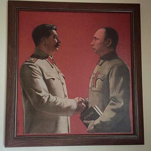 Користувачі соцмереж активно обговорюють картину, на якій зображений Володимир Путін та Йосип Сталін. На малюнку президент Росії тримає в руці книгу “Крим” та потискує руку Йосипу Сталіну. Про це інформує Телеканал новин “24”.