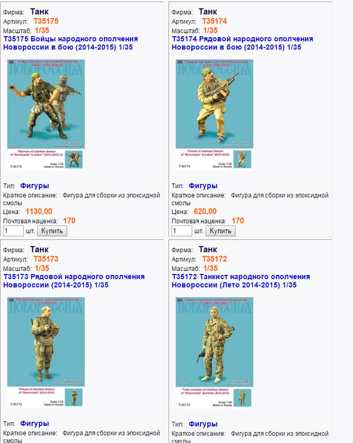 «До послуг колекціонерів моделі бійців і командирів «народного ополчення Новоросії» в числі яких фігурка «командира народного ополчення Новоросії» "Біса".