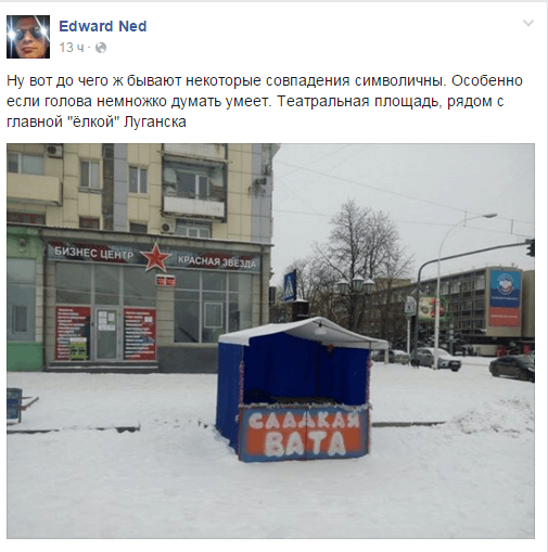 У самому центрі окупованого Луганська на Театральній площі відбувся дивовижний збіг: поруч з нещодавно відкритим бізнес-центром з модним в нинішніх реаліях "ЛНР" назвою "Червона зірка" поставили намет з солодкою ватою.