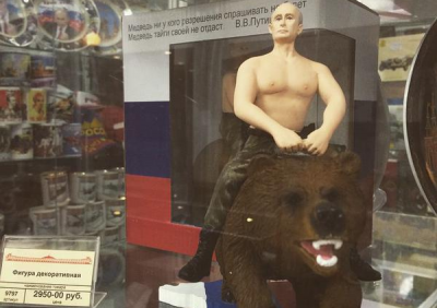 У Центральному музеї Великої Вітчизняної війни в Москві, в сувенірній крамниці виставили на продаж гумову статуетку по пояс голого президента РФ Володимира Путіна верхи на ведмеді. Про це у своєму twitter повідомив один з відвідувачів музею. Ціна статуетки - 2950 рублів, передає інтернет-видання Хроніка.інфо з посиланням на Сегодня.