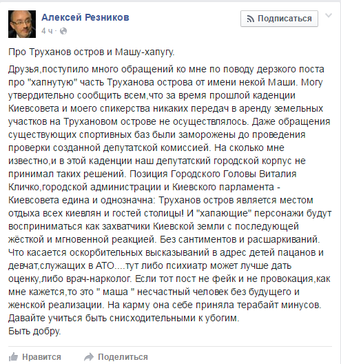 Заступник міського голови Києва Олексій Резніков відреагував на зухвалий допис безапеляційним твердженням, що за час його каденції на Трухановому острові ніхто не отримував земельні ділянки. “ "Навіть звернення чинних спортивних баз були заморожені до проведення перевірки, створеної депутатською комісією. Наскільки мені відомо, і в цій каденції наш депутатський міської корпус не приймав таких рішень", - акцентував чиновник. Резніков підкреслив, що позиція мера Києва Віталія Кличка та депутатського корпусу КМДА по Трухановому острову є принциповою: ця місцина є місцем відпочинку усіх киян та гостей столиці. Заступник мера зауважив, що реакція на подібне "хапання" землі буде швидкою й жорсткою.