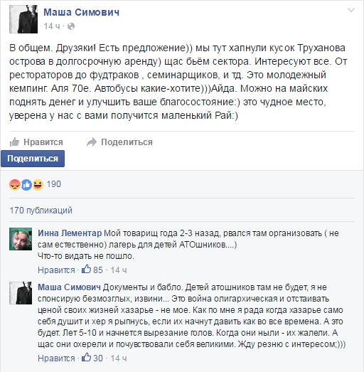 Новоспечена орендарка зазначила, що земельна ділянка є "молодіжним кемпінгом", тому вона запрошує проводити там семінари. Сімович написала, що також запрошує рестораторів та інших бізнесменів, котрі не проти "поліпшити свій добробут". Більш того, у коментарях одіозна одеситка, якій написали, що там планували робити табір відпочинку для дітей учасників АТО, жорстко відповіла коментатору. Військових жінка назвала "хазарьем", котре необхідно "давити".