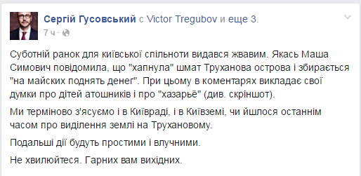 скільки зухвалий допис одеситки Сімович викликав вибуховий суспільний резонанс, питанням зацікавились у КМДА. Депутат Київради Сергій Гусовський пообіцяв, що з'ясує, чи отримував хтось останнім часом ділянки на Трухановому острові. Він зазначив, що "подальші дії будуть простими і влучними".