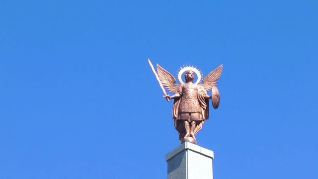 Увінчує пам’ятник двометрова скульптура Архистратига Михаїла, який віддавна вважається покровителем воїнів, з мечем і щитом.
