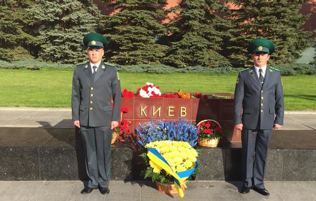 Співробітники посольства України в Російській Федерації самостійно прикрасили жовто-синіми квітами стелу Києва на Могилі Невідомого Солдата біля стін Кремля. Також біля стели було виставлено караул.