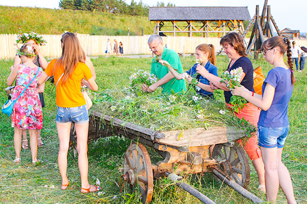 Вечірня програма буде яскравою в прямому сенсі слова, адже у Древньому Києві запалять багаття, і всі бажаючі зможуть стрибати через них – по одному або в парах. Апогеєм вогняних феєрій стане спалювання опудала Купала.