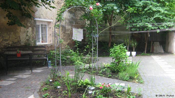 "Кущ бушману садили люди від GIZ, а цю папороть - уже наші жителі. Дизайнери показали, що і як садити, тепер люди вже самі докуповують квіти, кущі і саджають", - показує DW свій дворик Микола Волог, мешканець вулиці Мулярської у Львові. За його словами, сусіди задоволені реставрацією дворику, яку провели в рамках проекту Німецького товариства міжнародної співпраці GIZ: "Тепер приємно вийти у двір з горнятком кави, посидіти, побалакати з сусідами". Раніше подвір'я було вкрите потрісканим асфальтом і залишками фундаменту від старого будинку. Старе покриття тут зняли і зробили доріжки, посередині двору встановили спеціальну арку для трояндового куща, який тепер став окрасою дворика.