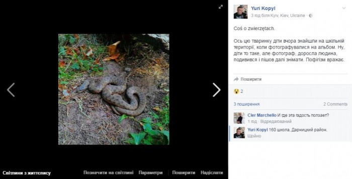 Незвичайний випадок стався в школі № 160 в Дарницькому районі. Як повідомляють кияни в групі «Батьки SOS» в Фейсбук, вчора на шкільній території діти знайшли змію, коли фотографувалися для альбому.