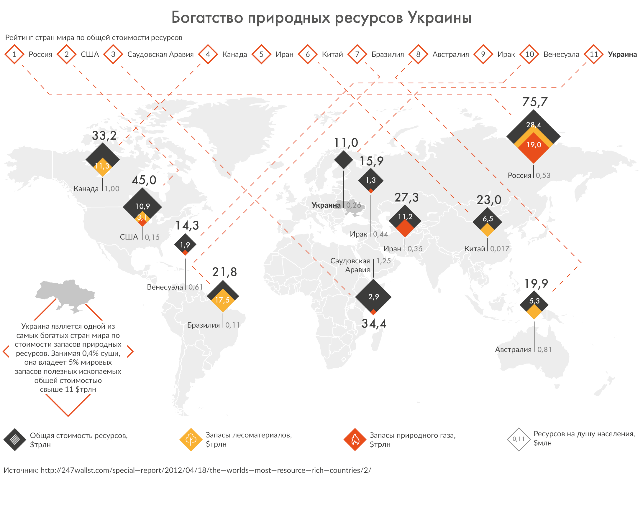 В такому випадку Україна на сьогоднішній день, після майже триразового падіння цін на нафту, гарантовано входить в десятку найбільш забезпечених природними ресурсами народів планети, в тому числі і за показником на душу населення.