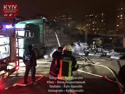 У Києві на парковці загорілася припаркована вантажівка з прицепом, передає УНН з посиланням на Київ Оперативний.