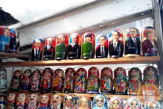 Відтак, на фото помітно, що окрім традиційних сувенірів із зображеннями Києва, на вулицях української столиці, зокрема на Андріївському узвозі, продаються і російські матрьошки. На останніх нерідко трапляються зображення президента Росії Володимира Путіна і прем'єр-міністра Дмитра Медведєва.