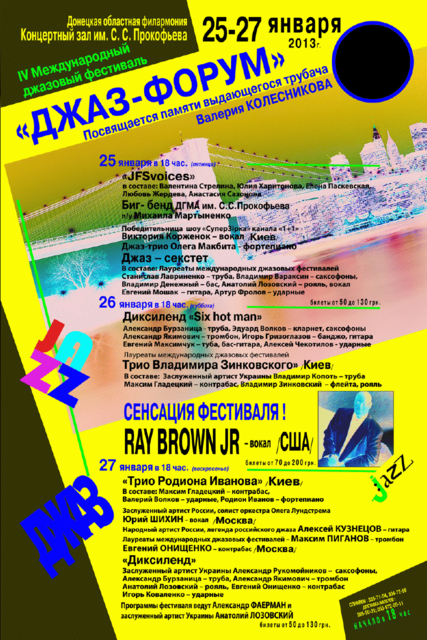 Четвертий раз поспіль Донецька обласна філармонія проводить Міжнародний фестиваль «Джаз-Форум». Перший Форум Джазу пройшов в січні 2010 року і відразу став помітною подією в музичному житті України. У фестивалі брали і беруть участь джазові колективи та виконавці першої величини з України, Росії, Америки, Німеччини і т.д. Відкрита фестивальна сцена і молодим талантам, саме на «Джаз-Форумі» заявили про себе, як про зрілих майстрів імпровізаційної музики: Валентина Стреліна (вокал, перкусія), Олександр Макаров (труба), Андрій Любар (труба), Артем Марченко (барабани) , Михайло Мартиненко (керівник біг-бенду, аранжувальник). З торішніх виступів хочеться виділити авторські композиції німецько-американського дуету «Spiritual Standarts» Яна фон Клевіц (а-сакс) і Маркуса Бургера (ф-но), ними ж для студентів і викладачів Донецької музичної академії був даний майстер-клас. Максим Піганов (Москва) подарував любителям традиційного джазу шоу тромбонів. Чудовий, вище всіх похвал був вокал Грейс Гарланд із США. Не обійдеться без сенсацій і в цей раз: хедлайнер фестивалю - Рей Браун (мол.) - син легендарних, іншого слова не підбереш, Елли Фітцджеральд і Рея Брауна, також у 2013 році гостями фестивалю, який проходитиме з 25 по 27 січня в концертному залі ім. С.С.Прокоф 'єва, стануть відомі джазові колективи з Києва, Москви Донецька.
