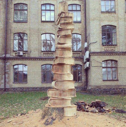 Скульптор Єгор Зігура біля Політехнічного інституту вирізує із столітнього бука скульптуру у вигляді стосу книжок. Працює над нею вже півтора місяці.