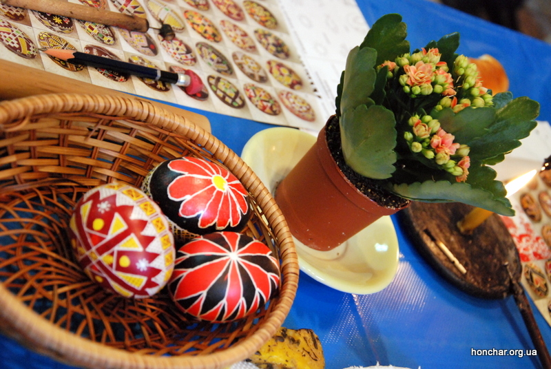 Доповнять ваш гарний настрій понад півсотні народних майстрів, що спеціально до передвеликоднього ярмарку підготували свої кращі мистецько-вжиткові витвори - написали писанок вашим рідним на подарунки; понаплітали кошиків, щоб було вам куди святкову смакоту складати; понавишивали сорочок, щоб було в чому йти до церкви; повикручували на гончарному колі мисок, глечиків та горщиків, щоб було вам в чому готувати святкові страви та подавати на стіл. А ще нарізали з дерева ложок, наткали килимів та понаробляли з усіляких еко-матеріалів іграшок для ваших діточок.