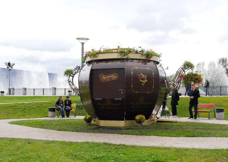 За словами Анфілова, дизайнери та фахівці з турсервісу міркували над виглядом пункту кілька місяців. Розглядались варіанти спорудження у вигляді валізи для подорожей, шоколадки, яблука, але зрештою перевагу віддали чайнику, як символу гостинності і затишку. Відтак, в результаті вийшла конструкція, з кованою ручкою, носиком та кришкою.
