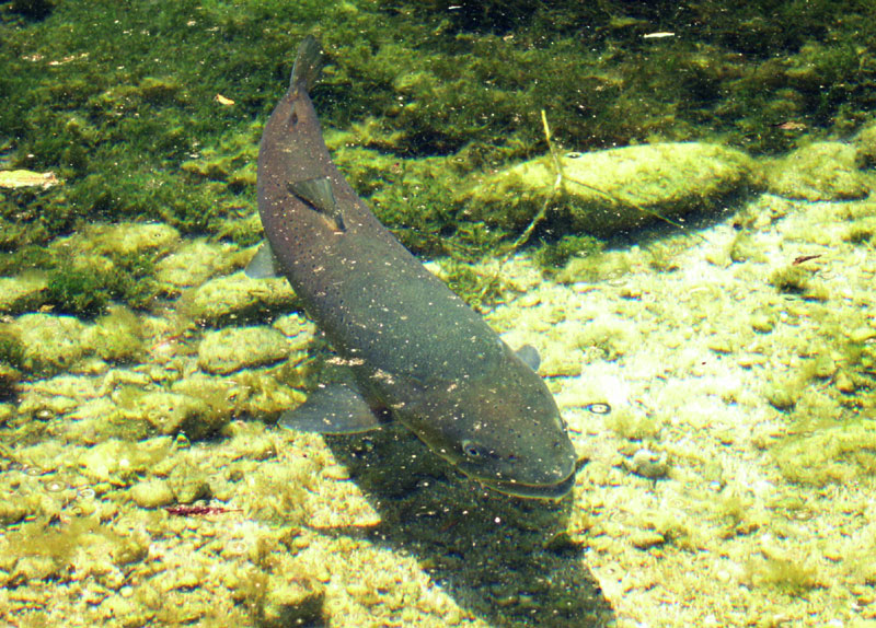 Тіло подовжене, низьке, покрите дрібною лускою. Голова сплющена з боків, як у щуки. На кістках ротової порожнини розташовуються зуби. Спинний плавець високий, за ним знаходиться жировий плавець. Хвостовий плавець сильно виїмчастий. Спинна частина тіла і голова сірого кольору, засіяні чорними плямами. Бока світліші, ніж спина, черево біле. З боків тіла у молодих особин є кілька темних смуг.