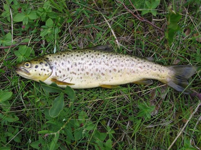 ФОРЕЛЬ СТРУМКОВА. Salmo trutta fario L. Форель струмкова — надзвичайно цінна риба з родини лососевих. Вона має товсте видовжене тіло, на хвостовій частині якого є невеликий, без променів жировий плавець. Тіло зеленувато-коричневе. На спині, на жовтувато-сірих плавцях розкидані численні червоні, чорні та білі плями. Залежно від умов середовища забарвлення змінюється.