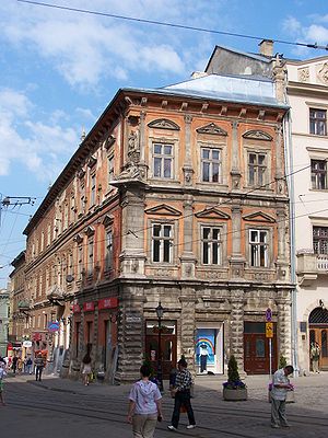 Кам’яниця німецьких магнатів Шольців-Вольфовичів побудована у 70-х роках XVI століття у стилі німецького Відродження, прикрашена скульптурною композицією «Хрещення». Перший власник будинку прославився у Львові тим, що спільно зі своєю дружиною дав життя 24 дітям. До кінця свого життя заможний Вольфганг Шольц та його дружина Мельхіора Гасе стали родичами практично усіх львівських можновладців. На Ринку Шольцам-Вольфовичам належало кілька кам’яниць. Фасад кам’яниці прикрашений серією скульптурних портретів, які зображують представників різних прошарків тогочасного львівського суспільства.