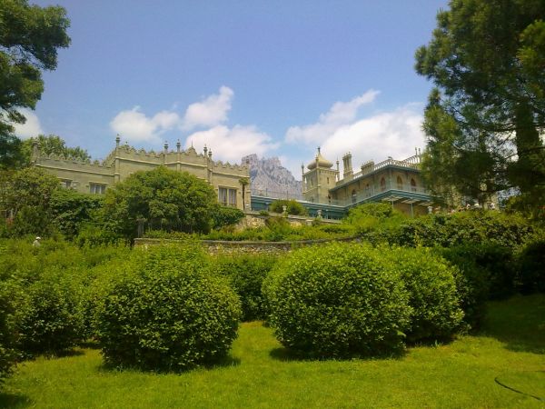 Пристінний фонтан "Амури" розміщений перед бібліотечним корпусом на третій терасі в так званому Грузинському дворику і замикає собою перспективу маленького майданчика, розмір якого відповідає його камерному характеру. Фонтан складається з плити-горельєфа, встановленої на задній стінці водоприймального басейну і закріпленої в скелі. Водоприймальний басейн свого часу спирався на діабазові голови левів (нині замінені на кам'яні блочки). Найцікавішою частиною фонтана є біломармурова прямокутна плита з сюжетним алегоричним горельєфом, якого більшість дослідників вважає твором XVII або XVIII ст. Символіка горельєфа (вода - джерело життя; корабель - торгівля, добробут; поливання квітів -плекання науки) була співзвучна різнобічній діяльності М. Воронцова. Можливо, саме через це плита була закуплена ним в Італії. Парк, який займає площу 40 га, є невід'ємною частиною палацового комплексу. Він створювався одночасно з будівництвом палацу запрошеним німецьким садівником К. Кебахом. У роботах активну участь брав директор Нікітського ботанічного саду А Гартвіс. Пильну увагу створенню парку приділяла Є. Воронцова, визначаючи тематику окремих композицій. Дві селекціоновані А. Гартвісом троянди були занесені до світового каталогу. Одна з них дістала назву "Елізабет Воронцова". Дерева, чагарники, квіти постачалися з усіх країн світу і насамперед з Нікітського ботанічного саду та парку "Олександрія", що в Білій Церкві. За характером рельєфу та зелених композицій парк виразно поділяється на Верхній (західна та східна частини) і Нижній (центральна та східна приморські частини). В основу побудови парку було покладено ідею створення його в романтичному ландшафтному, тобто найбільш наближеному до природи, стилі, яким захоплювалася Європа у 2-й половині XVIII ст. Визнано, що парк в Алупці, поряд з парком "Софіївка" в Умані та "Мопрепо" під Виборгом, є найяскравішим серед парків на теренах Російської імперії втіленням цих романтичних настроїв. Великого значення в парку було надано розкриттю зовнішніх панорам, особливо після приїзду до Алупки у складі царської свити знавця цієї справи поета-романтика В. Жуковського, який відзначив недостатній зв'язок парку з довкіллям. Щоб виправити цей недолік, М. Воронцов навіть виїхав до Англії для ознайомлення з особливостями пейзажних парків. Після цього Верхній парк розкрив перспективи на гірське пасмо з домінантною вершиною Ай-Петрі, а Нижній - в бік неосяжного моря. Розпочалося будівництво парку з освоєння в 1824-1829 pp. північно-західного кута території Верхнього парку, що було пов'язано з будівництвом тимчасового житла господарів. Тут закладено оливковий та перший у Криму (найбільший і досі) кипарисовий гай, посаджено перші магнолії, очевидно, привезені з парку "Олександрія". Існуюча нині екзотична пальмова алея - пізніших часів, вона посаджена в 1860-1880 pp. садівником І. Бешковичем. З будівництвом головного корпусу палацу на схід від нього розпочалося створення найбільш романтичної частини Верхнього парку, до якої входять Малий і Великий хаоси та їхнє довкілля. Малий хаос - це нагромадження скель і великого каміння в поєднанні з дикою та спеціально посадженою рослинністю, аранжовані К. Кебахом у 1824— 1827 pp. у своєрідну низку природних інтер'єрів, пов'язаних стежками з короткими "древніми" напівзруйнованими сходами. Це м