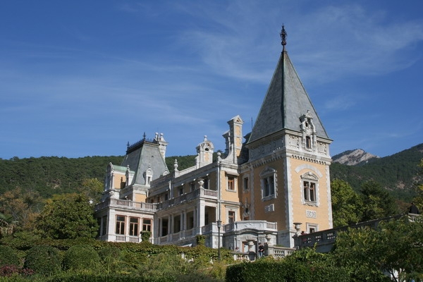 Палац розташований в оточенні лісу на гірському уступі, з якого відкривався чудовий краєвид моря та Ялти (нині значно закритий деревами). Ця місцевість добре відома ще з давніх-давен. Поряд - могили таврів, фундаменти церкви XII-XV ст., залишки давньогрецького храму, на фундаментах якого на замовлення генерал-губернатора графа М. Воронцова архітектор Ф. Ельсон у 1828 р. побудував церкву св. Іоана Предтечі (зруйнована землетрусом у 1927 p.), старовинне кладовище та ін. На початку 1830-х років на місці сучасного палацу розташовувався "панський", або "економічний" будинок, споруджений М. Воронцовим - власником Верхньомасандрівського маєтку, придбаного ним у 1828 р. Як свідчать сучасники, це був призначений лише для літнього відпочинку будинок із сірого каменю, простий за конфігурацією, з контрфорсами, відкритою до моря глибокою галереєю та вежею. У 1878 р. будинок значно постраждав від бурі, і син М. Воронцова - Семен вирішив побудувати на його місці новий палац, призначений для відпочинку-лише однієї сімї. Це було доручено французькому архітектору М. Бушару який і вирішив виконати його в романтичних формах французького Ренесансу. У1880 р. палац був начорно завершений, але архітектор М. Бушар раптово помер. Будинок у Масандрі, як і місцевість навкруги, були добре знані царській родині у зв'язку з тяжким захворюванням туберкульозом легенів матері Олександра III Марії Олександрівни. За порадою лікарів її чоловік - імператор Олександр II придбав для неї Лівадію, але найкраще цариця почувала себе у Верхньомасандрівських лісах, повітря яких було насичене запахом гірської сосни. З огляду на це господарі маєтку впорядкували прилеглу до будинку частину лісу яка дістала назву "Парку імператриці Марії": проклали стежки, влаштували оглядові майданчики, гроти тощо, а також збудували нову під'їзну "государеву дорогу" 3 Ялти, прокладену так, щоб вона охоплювала найкращі оглядові місця гірського ландшафту. Тяжко хворів на туберкульоз легенів і старший син Олександра III - Георгій, який також часто відпочивав тут. Тому при першій нагоді Олександр III придбав у 1889 р. Верхньомасандрівський маєток разом з будинком, а точніше, вже з напівзбудованим палацом. Він вирішив лише довершити будівництво палацу, обладнавши інтер'єри, і взимку 1891-1892 pp. доручив цю роботу відомому йому за іншими замовленнями архітектору М. Месмахеру. Останній виконав проект, затверджений у липні 1892 р. За часів Бушара на головному східному фасаді домінантну роль відігравали дві прибудовані до стіни крутлі вежі. М. Месмахер, зберігаючи їх та бажаючи зробити головний фасад більш репрезентативним, будує по центру охоплений парадними двійчастими сходами двоповерховий ризаліт, в якому розмішує вестибюль на 1-му та сіни на 2-му поверхах. Підвищивши ризаліт понад стінами палацу аттиковою надбудовою з бароковим за формою фронтоном, він завершує його зрізаною параболічною банею з флагштоком.ддя імператорського штандарту. Замість невеликої вежі на південному (причілковому) фасаді М. Месмахер створює нову вежу, квадратну в плані й більшу за вежі на головному фасаді. Надаючи їй значення домінанти, він підвищує її над карнизом будівлі й завершує високим чотирибічним шатром, увінчаним позолоченим двоглавим орлом.який проглядався з усіх куточків Ялти та її довкілля. Живописний силует палану з підкресленою асиметр