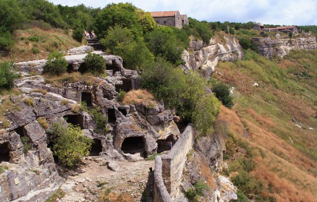 XVIII ст., що належала видатному караїмському історику А. Фірковичу, чи не останньому мешканцеві легендарного міста. 128-метрова східна стіна з чотирма вежами замикала місто з боку сідловини. Це був єдиний шлях, яким в місто можна було в’їхати на візку. Вибоїста, вибита у щільних вапняках дорога до Східних пролягала через (названу на честь палестинської) Йосафатову долину, де в Х-ХІХ ст. іудеї (караїми), що відкидали Талмуд, ховали своїх небіжчиків.