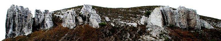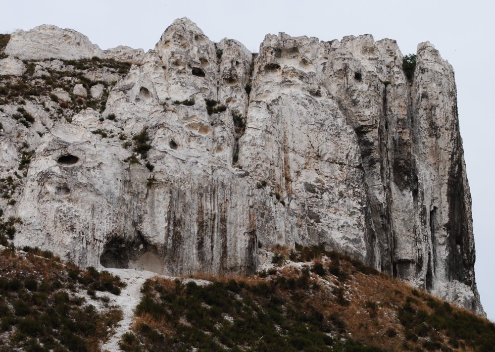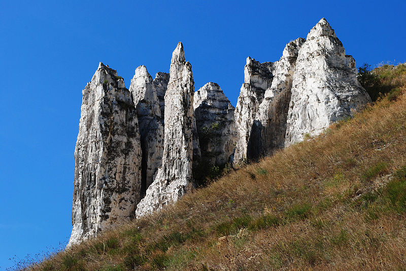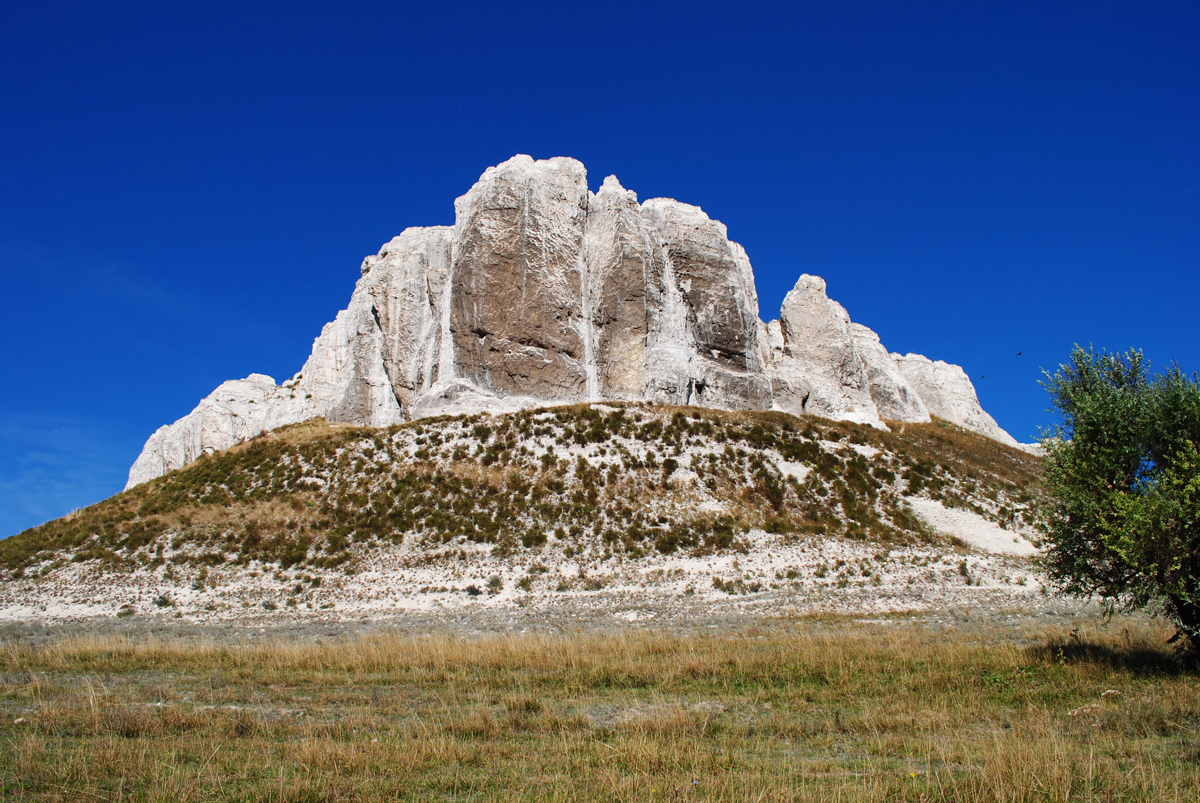 Ще здалеку, на фоні літнього блакитного неба вид-ніється крейдяна гора. Зі східного краю вона обривається вертикальними біло-сірими скелями, що нагадують руїни грандіозного замку. І чим ближче ми підходимо до скельних оголень, тим вони величніші. Вирізьблений природою колос підіймається більш ніж на 25 метрів над луговою заплавою невеличкої степової річки — притоки Казенного Торця.