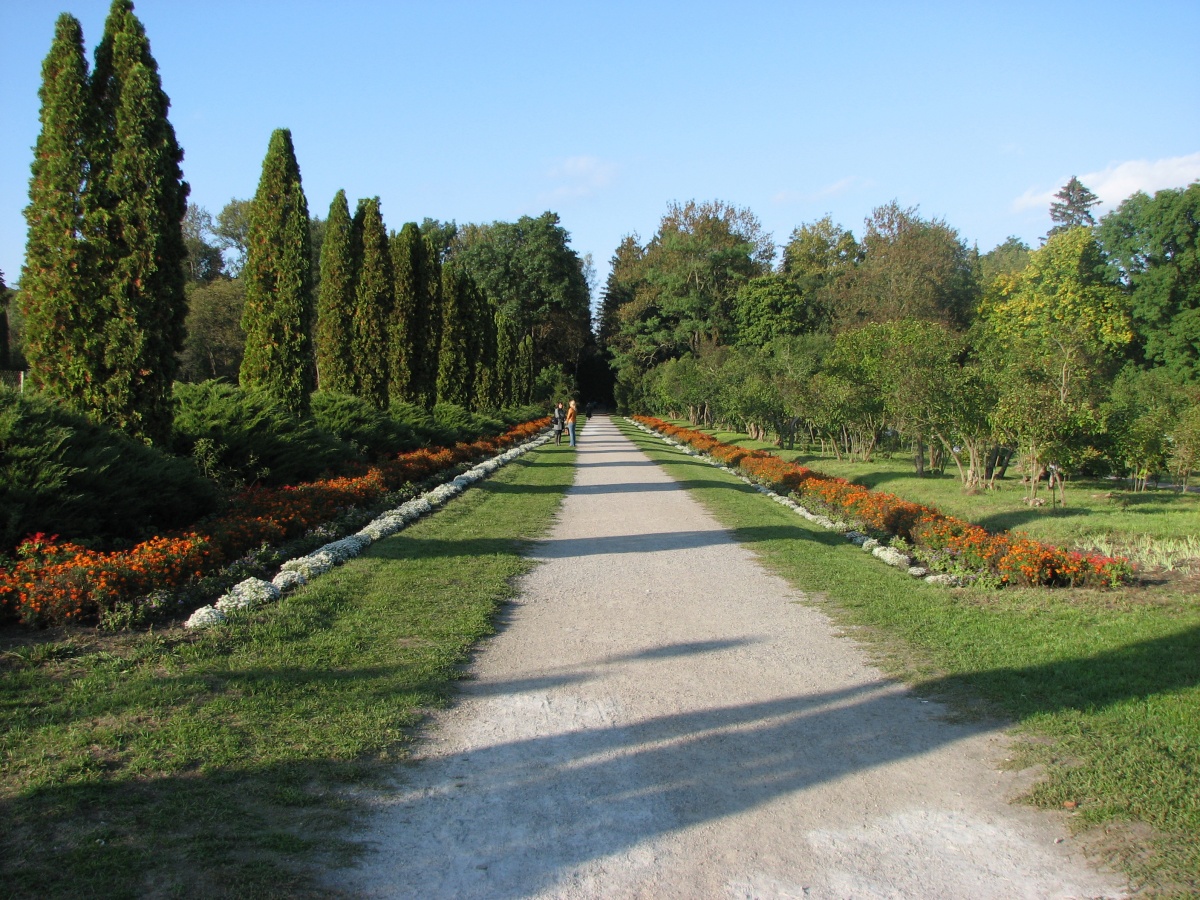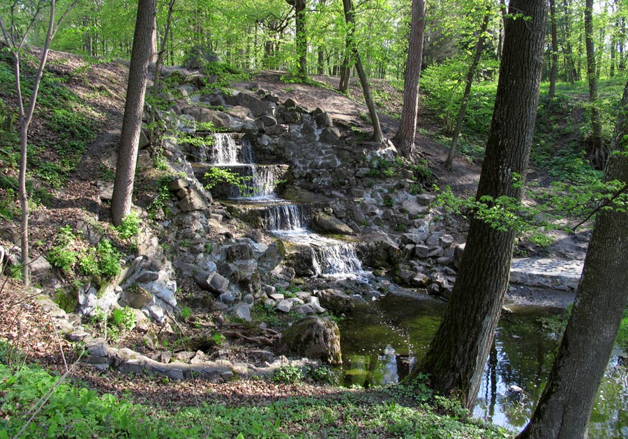 У1918-1920 pp. палацово-парковий ансамбль зазнав значних руйнувань, зокрема знищено споруди "Дідинця". У 1922 р. парк оголошено заповідником, а в 1946 р. передано в підпорядкування АН УРСР. У 1947 р. розпочалася реставрація парку. Його обнесено огорожею, проведено розчищення та насадження дерев. Протягом 1958-1967 pp. за проектами архітектора Д. Криворучка реставровано більшість паркових архітектурних споруд.Парк загальною площею 201,8 га розташований на південно-західній околиці міста на лівому березі р. Рось. З півночі його обмежує дорога на Сквиру. Рельєф парку утворюють три глибокі балки, які проходять майже рівнобіжно, розділяючи схил, що полого спускається до річки. Оскільки в балках були численні джерела, то на цій основі створено систему з 20 ставків загальною площею 12 га. Багато ділянок парку прикрашають виходи на поверхню граніту. Його ефектно використано в комбінації з водними протоками, що утворюють каскади й водоспади, та в оформленні джерел.Ландшафтною домінантою території є Палієва гора з рештками земляних укріплень початку XVIII ст., що розташована на березі річки в південно-західному куті парку.