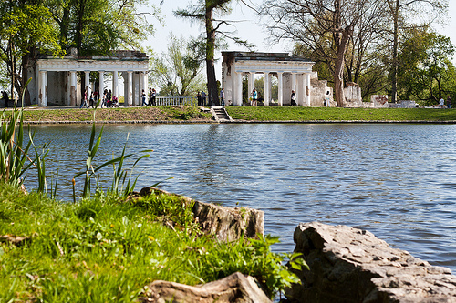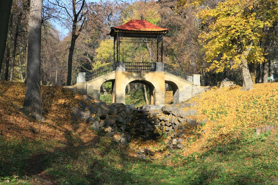 англійському пейзажному стилі і для його розпланування характерні криволінійне трасування доріг та алей і відсутність строгих осьових перспектив. Нинішні прямолінійні дороги й алеї прокладено в 2-й половині XIX- у XX ст. До найвизначніших гідрологічних об'єктів парку належать ставки - Холодний, Лазневий і Дзеркальний - та водоспад "Черепаха". Найвизначніші серед уцілілих архітектурних споруд - колонада "Відлуння", павільйон "Ротонда", арковий і китайський мости, "Руїни", фортеця "Варна", а також малі архітектурні форми - Колона смутку, джерело "Лев".Павільйон "Відлуння", або "Амфітеатр' прилягає зі сходу до Великої поляни. Мурована стіна, що в плані утворює півколо діаметром 32 м, доповнена колонадою іонічного ордера. Ця галерея фіксується по краях прямокутними в плані приміщеннями, причілкові стіни яких декоровані фронтонними портиками. Назва павільйону пов'язана з його унікальними акустичними особливостями. Потинькована й побілена, споруда сприймається світлим силуетом на тлі темних деревних крон і є композиційним акцентом Великої поляни.Павільйон "Ротонда" розміщений у східній частині парку недалеко від головного входу. Являє собою окремо розташовану монументальну екседру, призначену для встановлення скульптури: спершу -бюста імператриці Катерини II роботи скульптора Ф. Шубіна, згодом - скульптурного зображення князя Г. Потьомкіна. Екседру у фасадній площині перетинає масивний архітрав, підтримуваний чотирма колонами коринфського ордера. Внутрішню поверхню конхи екседри розбито на кесони.Арковий міст (однопрогоновий, мурований) у південній частині парку зв'язує берег водойми з півостровом. Його довжина -21м, ширина -2 м. Розташований з урахуванням найсприятливіших точок візуального сприйняття краєвиду.Китайський міст розташований з південного боку Великої поляни в місці перепаду рівнів каскадуставків у головній балці. Являє собою трипрогонову муровану конструкцію з альтанкою над середньою частиною, яка є майданчиком для огляду перспективи вздовж каскаду ставків.Незважаючи на перебудови та втрати, білоцерківський парк "Олександрія" - один з найкращих і найдавніших ландшафтних парків України, побудованих у стилі класицизму.