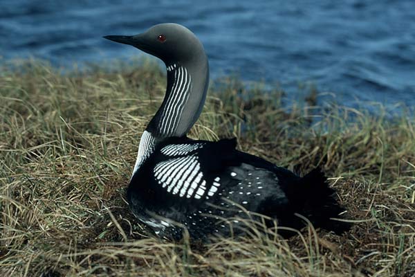 Чорновола гагара (Gavia arctica L.) більша від червоноволоі гагари. Забарвлення верху тіла влітку у дорослого птаха чорне. з великими білими плямами на спині здалеку помітно по дві плями з кожного боку). Голова і верх шиї попелясто-сірі. Горло і шия спереду чорні. По боках грудей і шиї поздовжні чорні смуги. Низ тіла білий. Дзьоб чорний і прямий. У птаха в зимовому оперенні верх бурувато-сірий, без білих плям. Горло, шия спереду і низ білі. Дзьоб сірий, темніший на кінці. Молодий птах (восени) схожий на дорослого в зимовому оперенні. Звуки (крик) різноманітні: нагадують стогін, гавкання, каркання. В польоті видає глухий крик, схожий на «га-га-га».